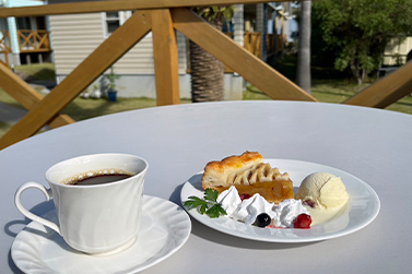 食後はカフェデッキにて潮騒に耳を傾けゆったりと何もしない時間を大切に心ゆくまでお寛ぎください。